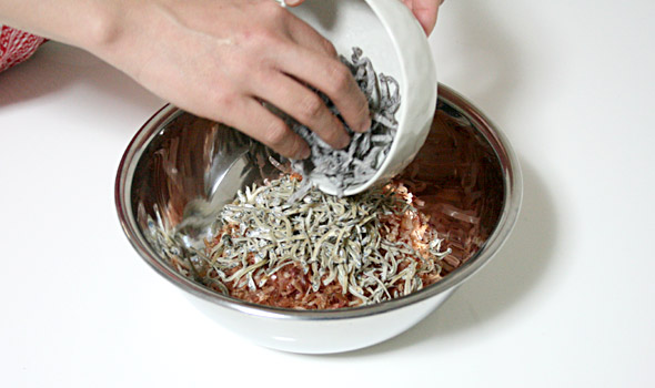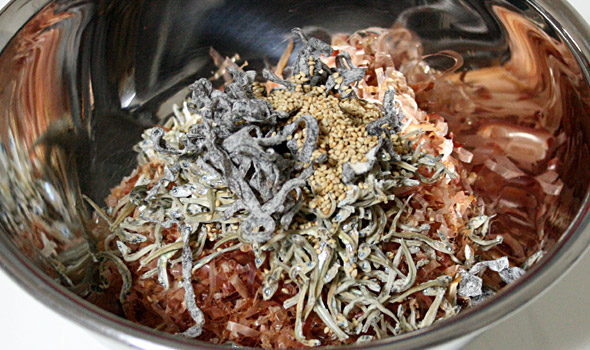 大きめの器にタレ以外の材料「いりこ」「ごま」「昆布」「花かつお」をすべて入れていきます。